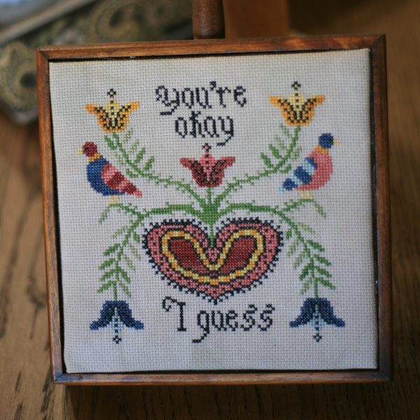 Floss: DMC 310, CLASSIC COLORWORKS: Red Currant, Tennessee Red Clay, Weeping Willow, Steamed Broccoli, Blacksmith Blue, Queen Bee, THE GENTLE ART: Toffee, Old Blue Paint